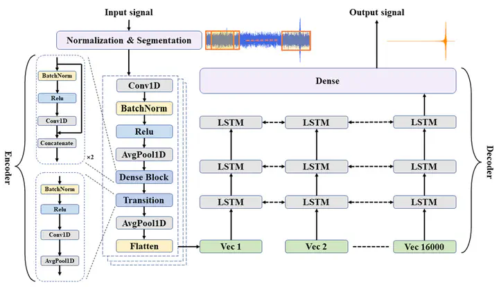 The architecture of our denoising autoencoder is delineated as follows. The input data is first subjected to normalization and segmentation (top left), resulting in the formation of overlapping subsequences. Each subsequence is then processed through the encoder to extract its characteristic feature vector. This is followed by passage through three bidirectional LSTM layers to yield predictive values. The final reconstructed waveform is then attained in the Dense layer (top right).
