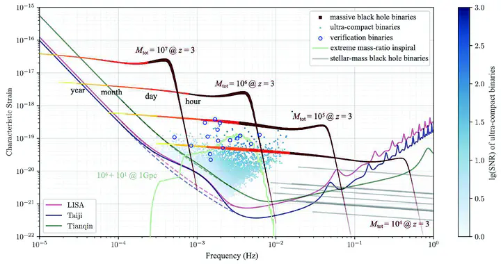 (Color online) The design sensitivity curves and primary target sources of the space-based gravitational wave detectors LISA, Taiji, and TianQin. The sensitivity of each detector is the total sensitivity of the first-generation Michelson-AET channel under the equal-arm-length approximation, expressed in terms of characteristic strain. The dashed curves represent the sensitivities resulting from instrumental noise (according to the noise requirements of LISA [11], Taiji [18], and TianQin [21]), while the solid curves represent the results after incorporating the galactic foreground noise.