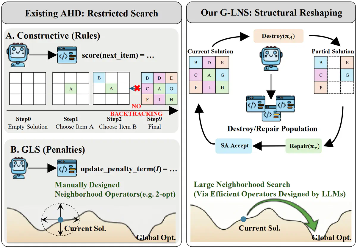 G-LNS (Generative Large Neighborhood Search) represents a breakthrough in automated algorithm design, leveraging Large Language Models to automatically create Large Neighborhood Search operators for combinatorial optimization problems. Unlike traditional approaches that restrict designs to fixed heuristic forms, G-LNS enables structural algorithmic innovation through the co-evolution of tightly coupled destroy and repair operator pairs.